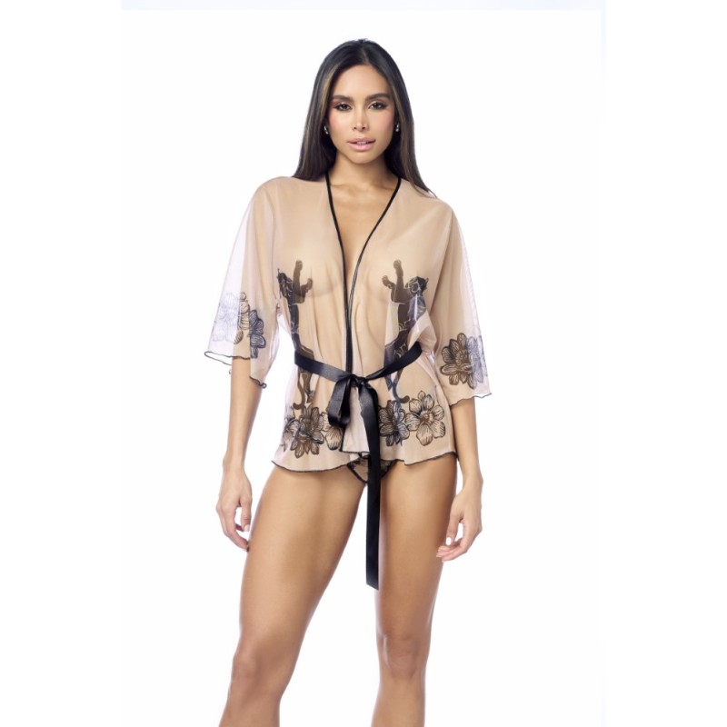 Own your edge. This sheer printed mesh robe features an adjustable waist tie for a flattering fit and comes with a matching panty. Bold, romantic, and undeniably sexy. Care instructions : Hand Wash. Do not Bleach. Do not Iron. Composition : Robe: Self Fabric: 95% Polyester 5% Elastane Binding 97% Polyester 3% Elastane 100% Polyurethane Coated Satin Ribbon 100% Polyester Country of origin : Colombia