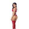 A playful three-piece with a frisky twist, featuring peek-a-boo top and bottom designs paired with a matching lace garter belt. Perfect for turning up the heat with every wear. Care instructions : Hand Wash. Do not Bleach. Do not Iron. Composition : Top: Self Fabric 100% Polyamide Mesh 95% Polyamide 5% Elastane Foldover Elastic 87.33% Polyamide 12.67% Elastane Strap Elastic 78.42% Polyamide 21.58% Elastane Satin Ribbon 100% Polyester Country of origin : Colombia