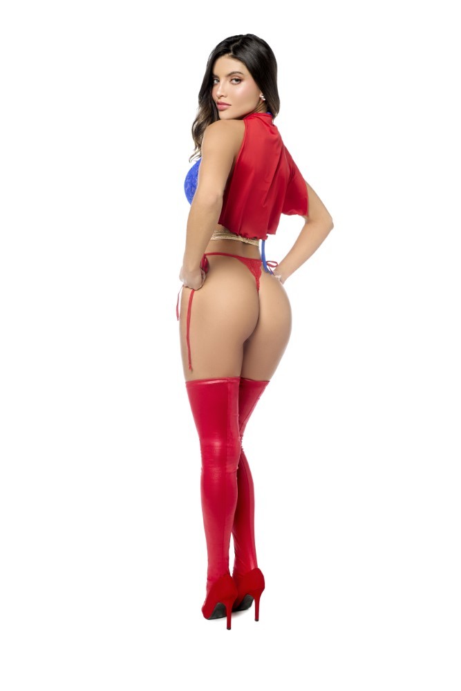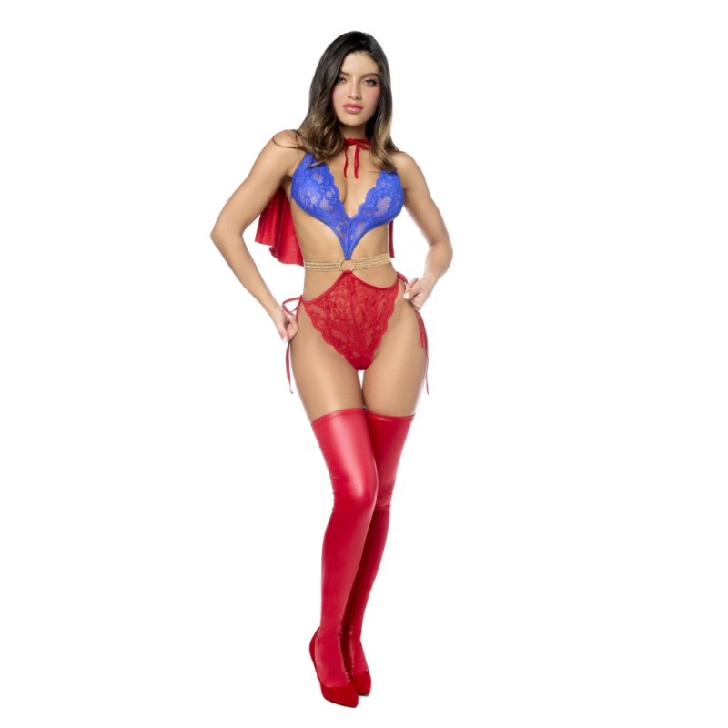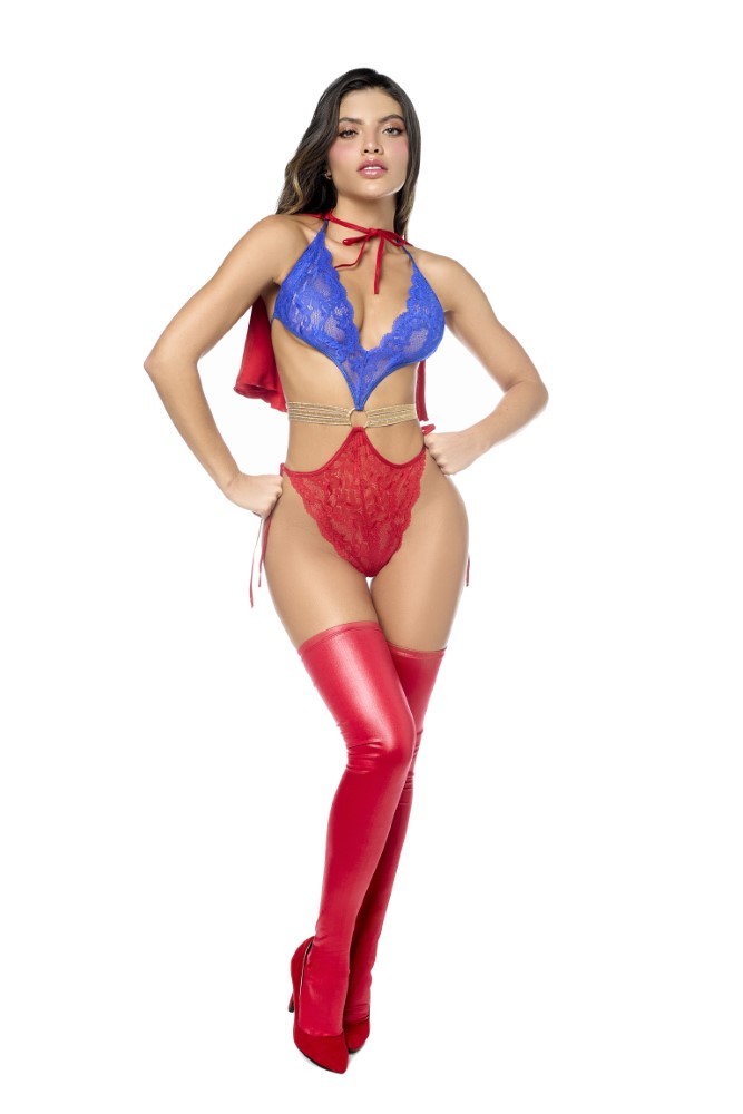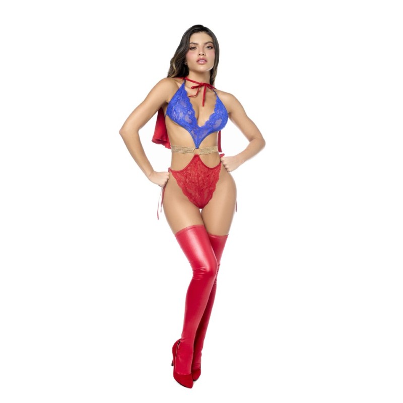 Show off your power curves in this sexy Super Girl costume. Features a halter lace bodysuit and a flowing cape for an empowering, fierce look. Care instructions : Hand Wash. Do not Bleach. Do not Iron. Composition : Body:Self Fabric: 90% Polyamide 10% Elastane Foldover Elastic 87.33% Polyamide 12.67% Elastane Waist Elastic 76.80% Polyamide 13.52% Metallic Yarn 9.68% Elastane Country of origin : Colombia